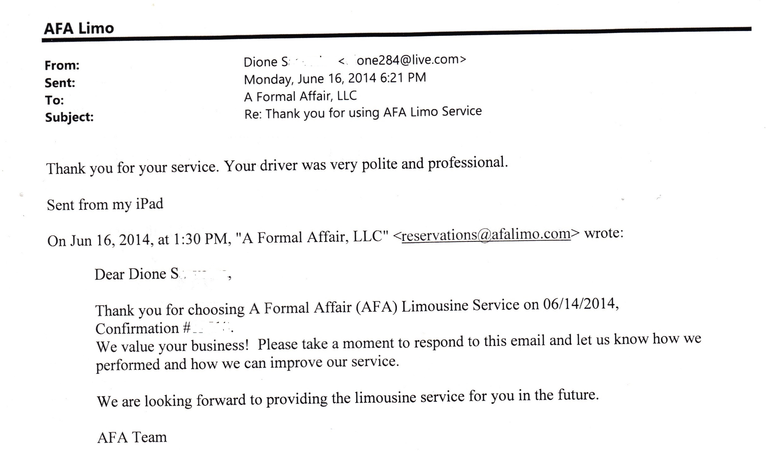 TESTIMONIAL SUBMISSIONS: Please send your testimony to reservations@afalimo.com. As a consumer of A Formal Affair Limousine Service services, by submitting your testimonial you give us permission to reprint, reproduce or use the testimonial in connection with our business. You also are agreeing to the following: