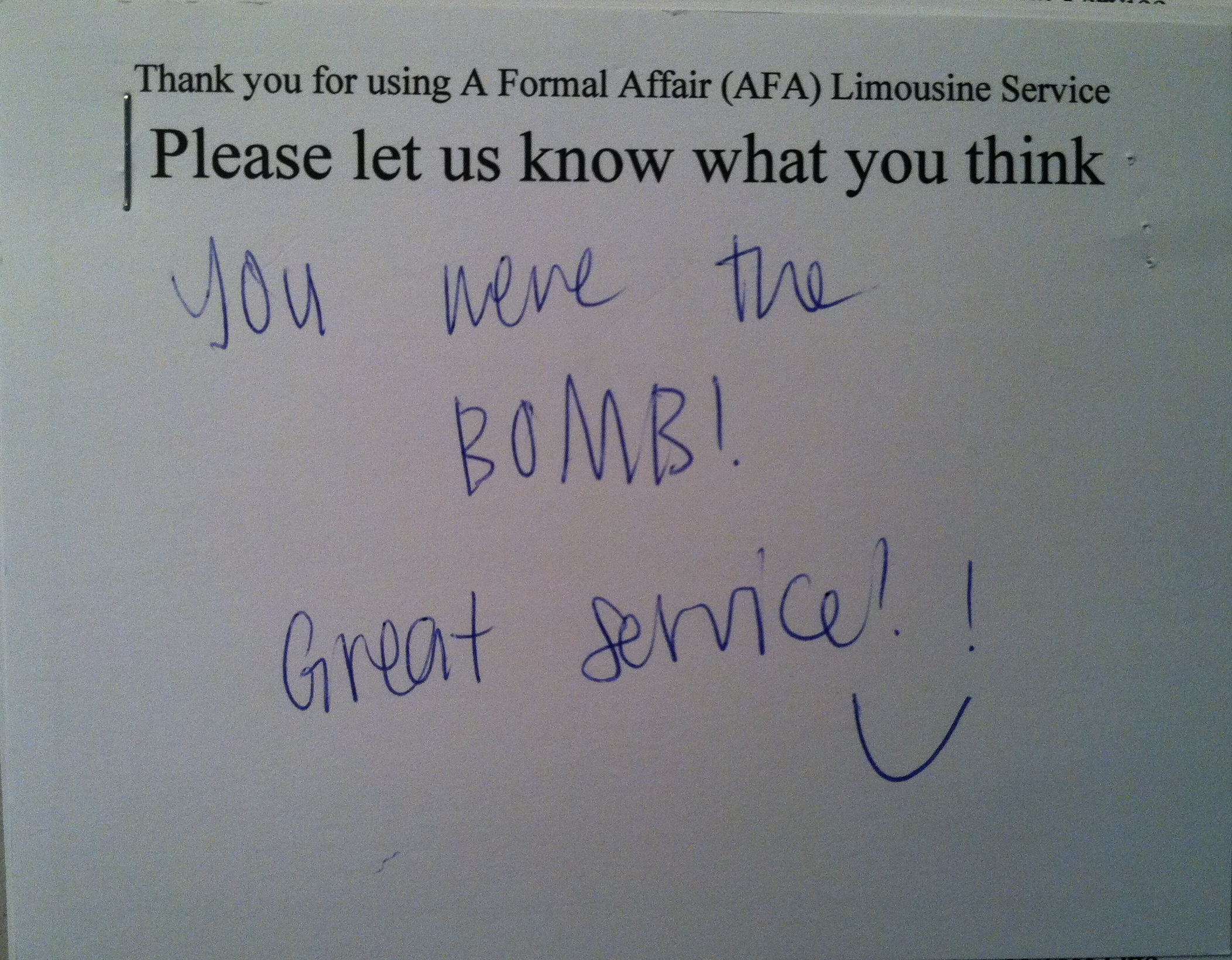 The testimonials appearing on this site are actually received via personal submission (AFA Limo feedback card or AFA email). They are individual experiences, reflecting real life experiences of those who have used A Formal Affair (AFA) Limousine Service in the past. However, they are individual results and results do vary. We do not claim that they are typical results that consumers will generally achieve. The testimonials are not necessarily representative of all of those who will use our products and/or services.