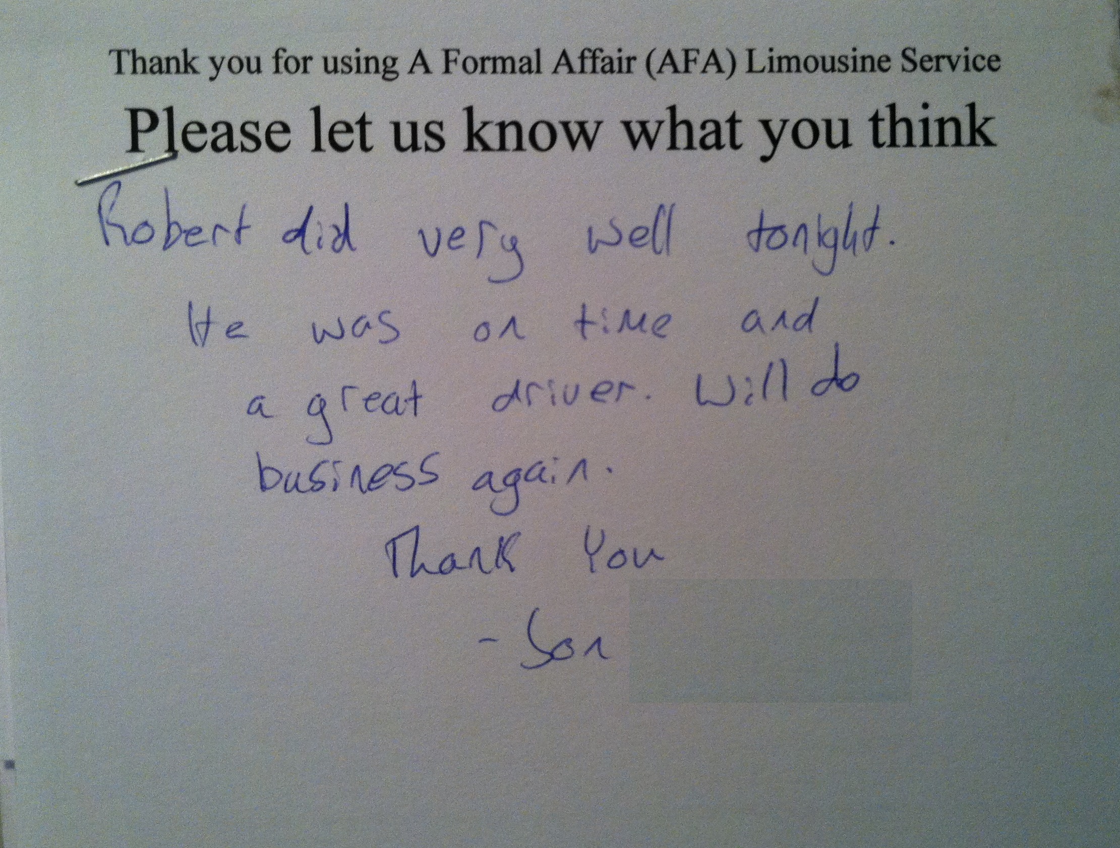 “Robert did very well tonight. HE was on time and a great driver. Will do business again. Thank you.”
