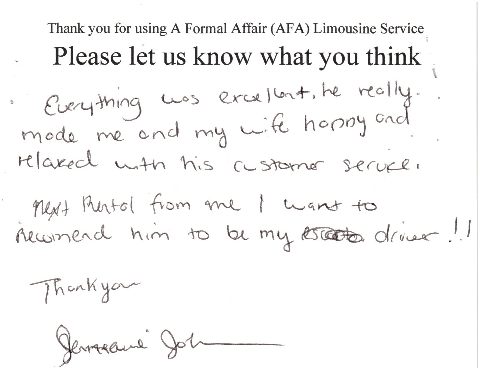 TESTIMONIAL SUBMISSIONS: Please send your testimony to reservations@afalimo.com. As a consumer of A Formal Affair Limousine Service services, by submitting your testimonial you give us permission to reprint, reproduce or use the testimonial in connection with our business. You also are agreeing to the following: